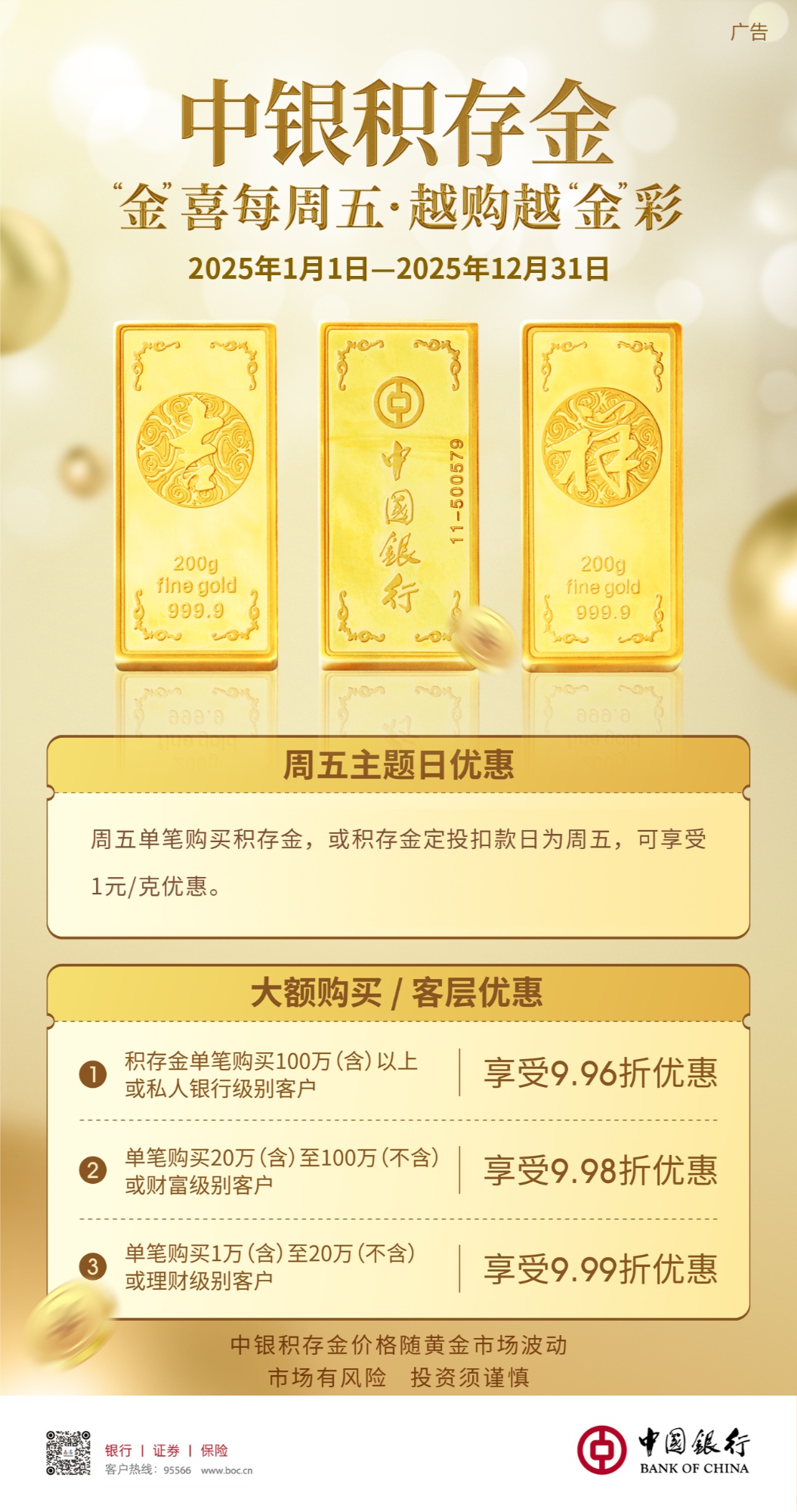 中国银行江西省分行推出单笔购买积存金,或积存金定投扣款日为周五,可享受优惠。