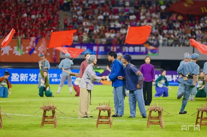 8月31日,在赣超联赛赣州对阵吉安的赛场上,大型红色文旅史诗剧《长征第一渡》惊艳登场。当《十送红军》的背景音乐响起,4万多名观众自发齐声合唱,一时间,手机闪光灯闪烁,体育场宛如一片璀璨星河。这一幕也通过社交平台迅速传播,相关话题全网播放量破5亿。