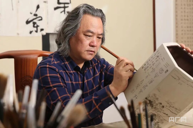 央广网宜兴2月15日消息 近日,记者走进江苏宜兴丁蜀镇一家工作室里,这里遍布历代紫砂图谱、碑帖拓片、画册史料。在一张摆满毛笔的方桌前,记者见到了正伏案创作的范建军,长发随意披在他的脑后,神情专注,双目炯然有神。