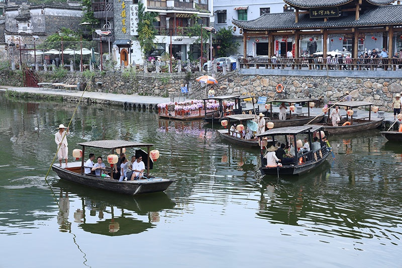 古镇青石板路蜿蜒曲折,徽派古宅错落有致,游客们徜徉其间,仿佛穿越时光;绕南以瓷源文化著称,陶窑遗迹与竹林溪涧相映成趣,让人流连忘返;而汪湖碧波荡漾、群山倒映,游人徒步而行,水光山色尽收眼底。三大景区如珠玉般点缀在青山绿水间,绘就一幅层次丰富的山水长卷。