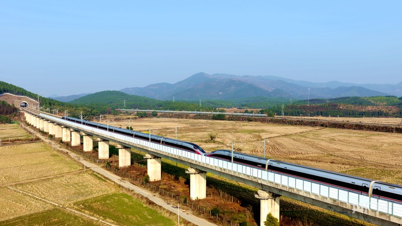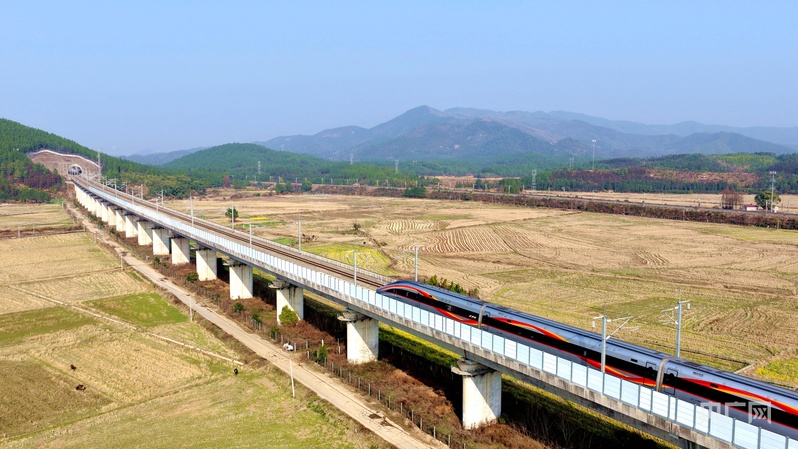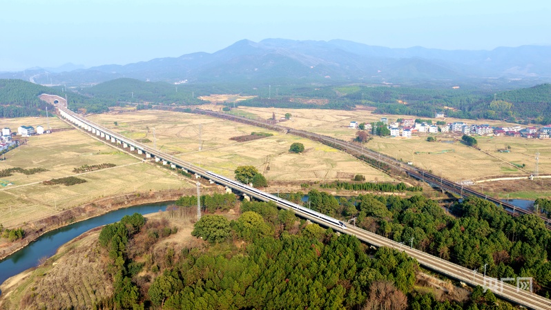 列车穿梭于田野山峦之间,构成一幅生动的高铁春运图景 (央广网发 宋靖辉 摄)