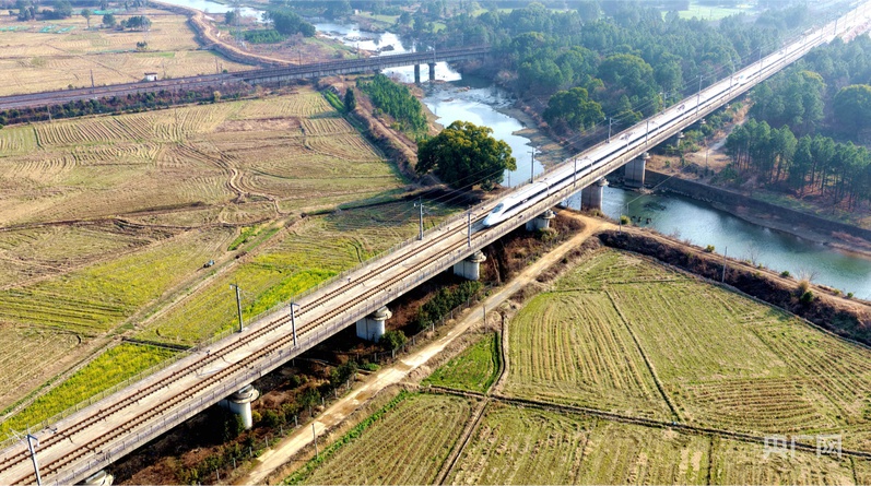 央广网吉安2月4日消息(记者郇康新 见习记者尹博)当前,各地交通运输系统已全面进入“春运模式”。2月2日,在京九铁路江西省吉安市峡江县水边镇段,一列高铁列车穿梭于田野山峦之间,构成一幅生动的高铁春运图景。